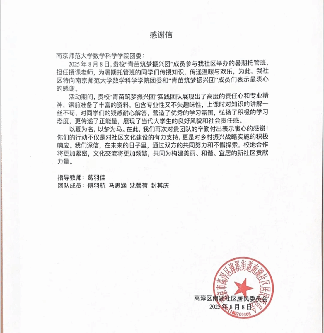 “青苗筑梦”乡村振兴促进实践团走进南京市高淳区,为暑托班儿童开展趣味课堂;在高淳老街体验非遗版画印刷,传承工匠精神;参访高岗耕读公社和城市形象展示馆,调研乡村振兴路径并提出青年建议。活动结束后,团队收到南湖社区的感谢信,进一步坚定了以所学服务基层、展现新时代青年担当的决心。