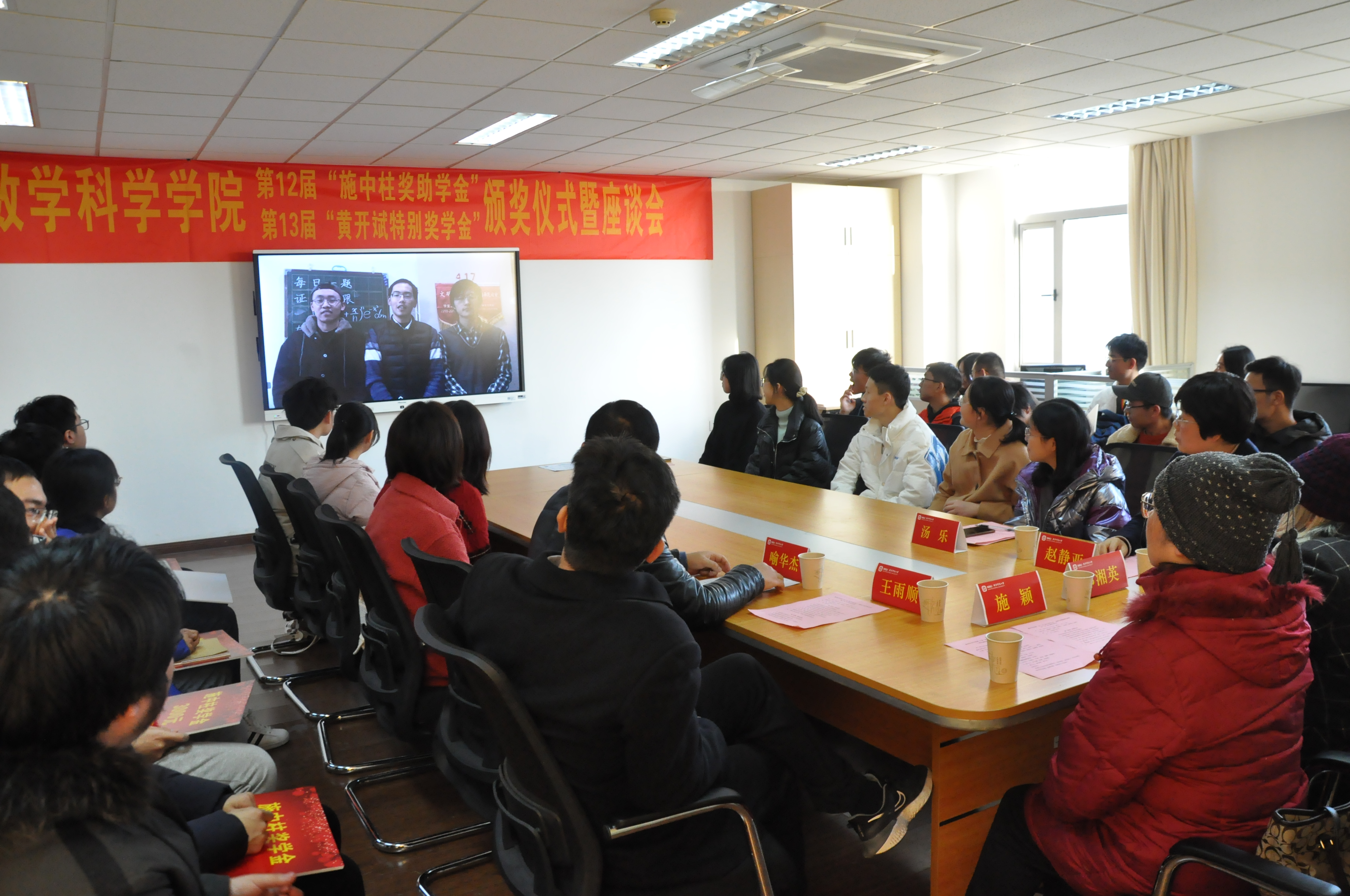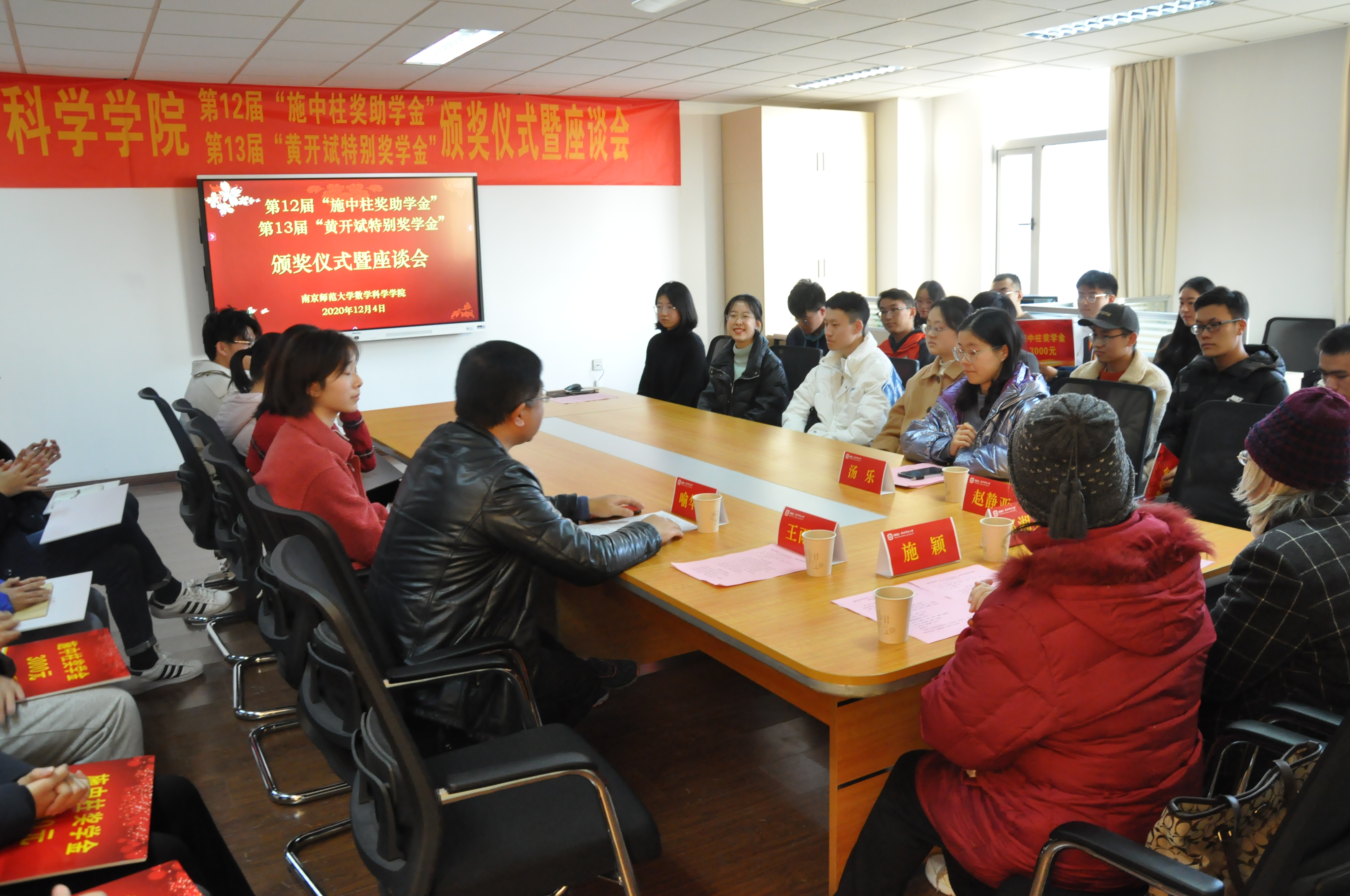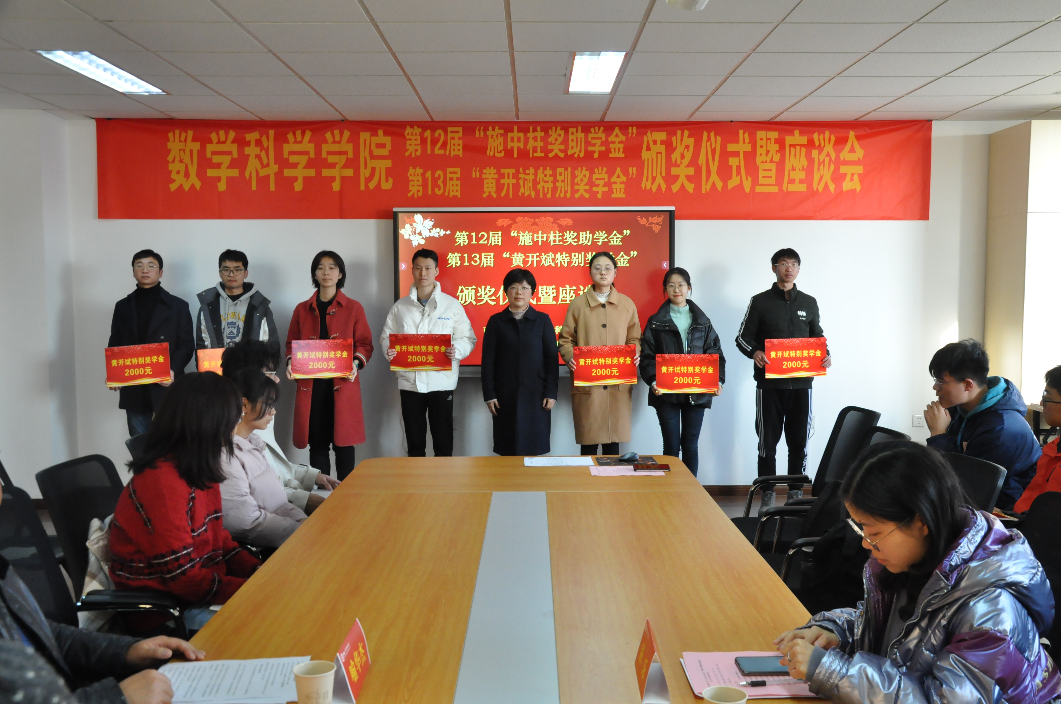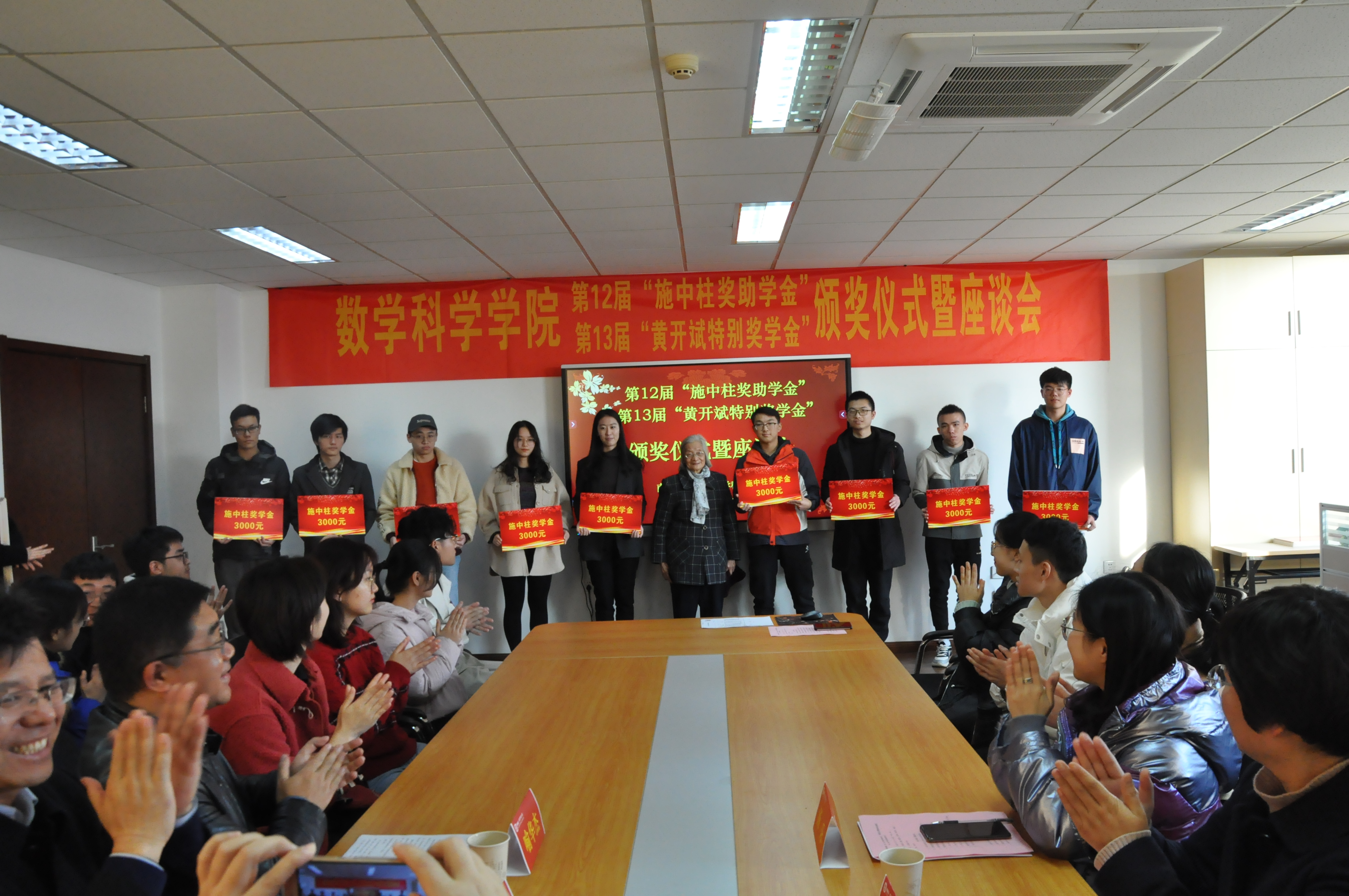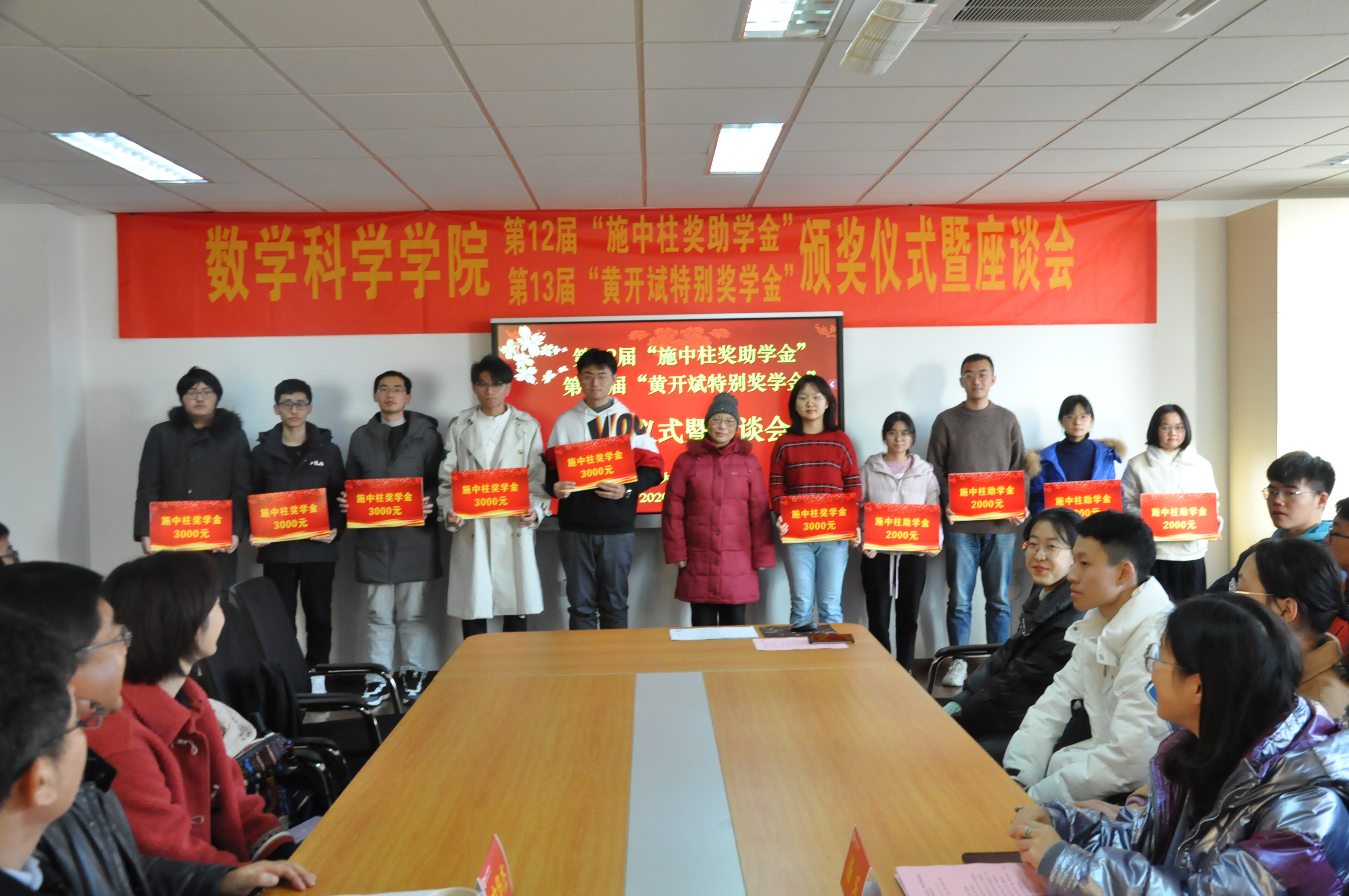 12月4日,行健楼549室内暖意融融,气氛热烈。数科院第12届“施中柱奖助学金”、第13届“黄开斌特别奖学金”颁奖仪式暨座谈会在这里隆重举行。“施中柱奖助学金”捐赠人、施中柱先生的爱人郭湘英女士,女儿施颖女士,数科院党委书记赵静亚,副院长王雨顺、院团委书记汤乐出席了本次颁奖仪式,来自来两项奖助学金获奖的本硕博30名同学参加了座谈会,活动由数科院党委副书记喻华杰主持。