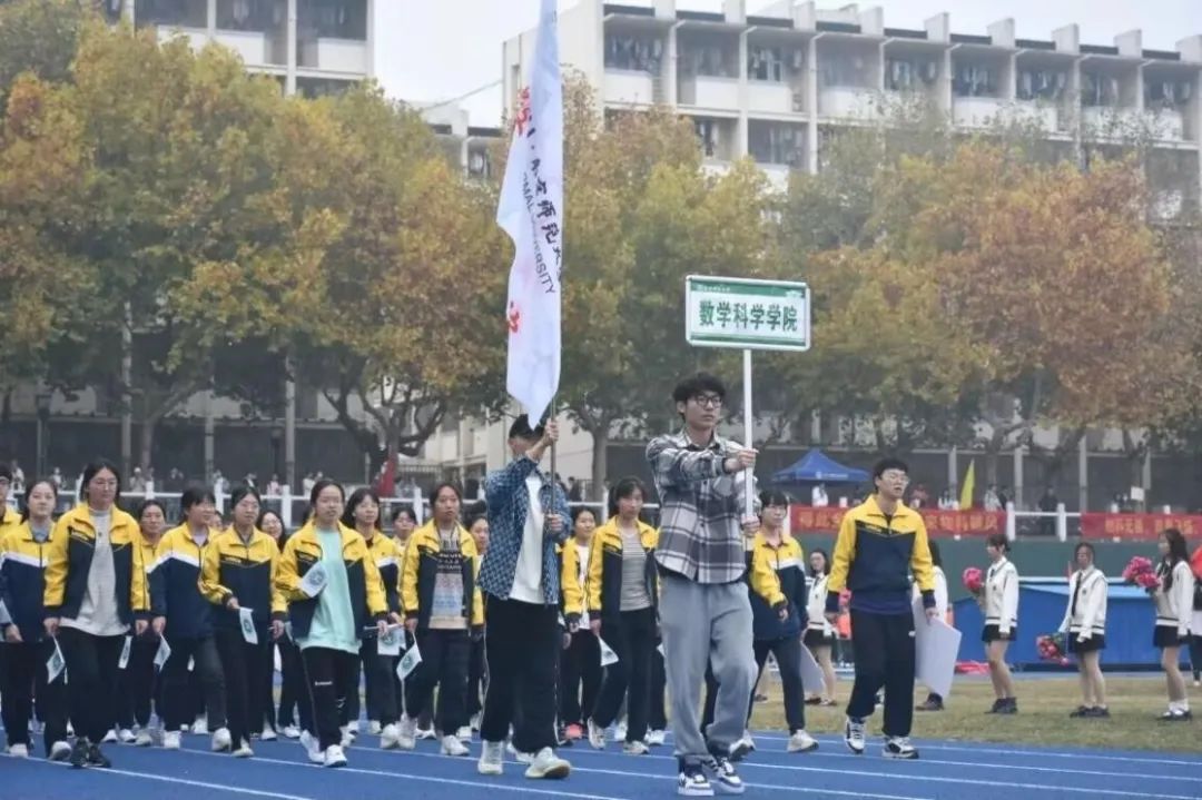 11月11日上午8时,我校第60届田径运动会盛大开幕,同学们在清晨集合于西区操场期待着本次运动会的举行。在雄壮激昂的乐曲声里,迎着初升的朝阳,南师学子们意气风发,组成了一个个大放异彩的方阵。数科院代表队的健儿们迈着铿锵有力的步伐,高举旗帜,尽显昂扬斗志。他们通过队列变换,摆出了数学中重要的字符π,转身面向主席台跳起的刘耕宏健身操凸显青春活力。健儿们喊出的“解几数分高代,数科全场最帅,发扬体育精神,展示青春风采”口号更是响彻整个运动场,留下了属于我们自己的回音。