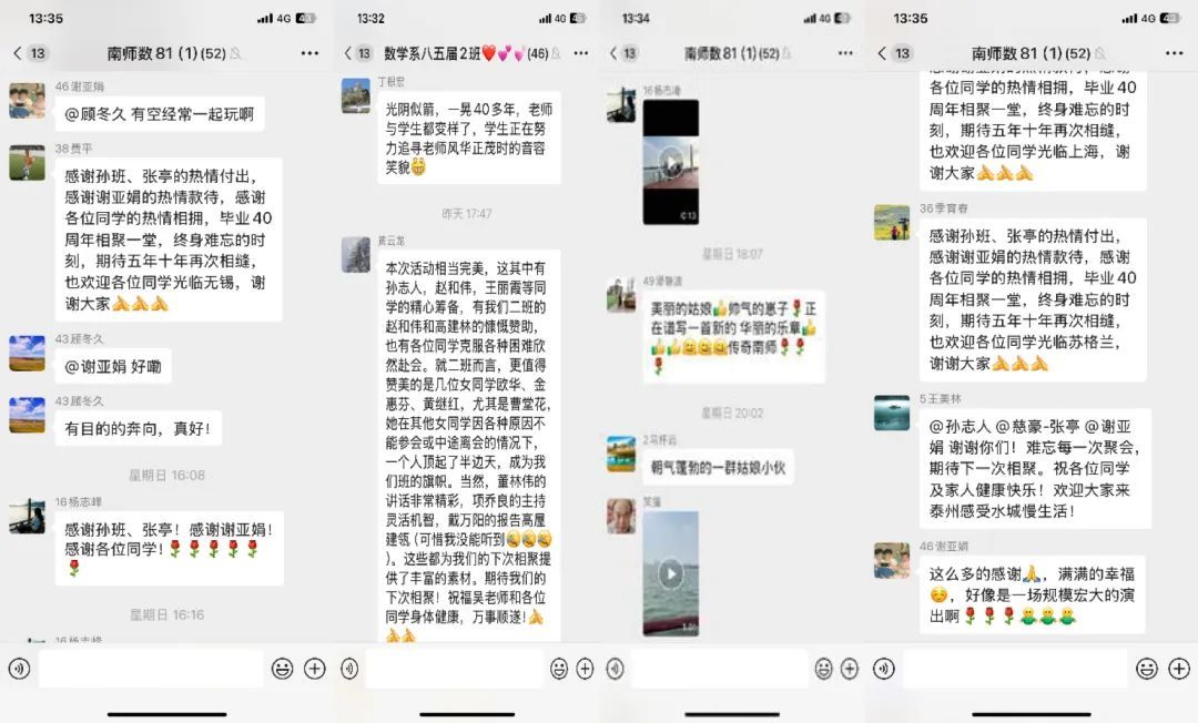 数学系85届同学交流见面会在小礼堂举行,同学们分享了各自取得的成绩、参加聚会的感想和感悟,畅聊同学之情。每位发言的同学都有说不完的话,道不完的情,讲不完的故事,纷纷回忆大学时代以及毕业后同学们的帮助、班主任与辅导员的引导、任课老师的教诲、校系领导的关心以及母校的持续关注,表达了对学校、学院的感恩之情,并感谢毕业40周年聚会筹备组的各项工作。随后在南山花园二楼大厅举行了数学85届毕业40周年欢聚午宴。