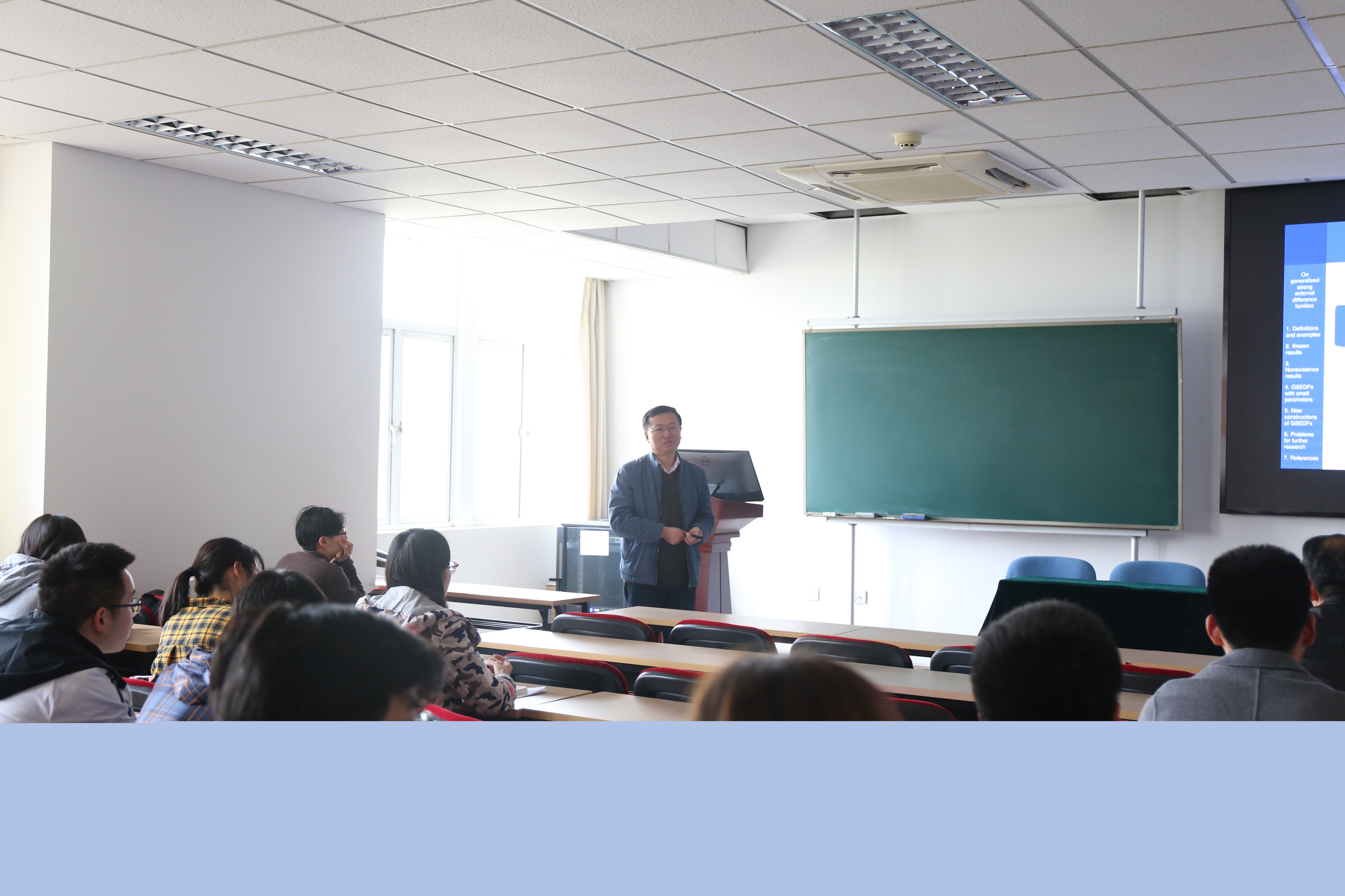 在报告的最后,曹海涛教授列举了一些可以进一步研究的问题,并猜测当子集个数大于2时,不是划分或者接近划分的广义强外差簇几乎都是不存在的。参加此次报告的师生和曹海涛老师进行了热烈的讨论。报告在老师和同学的掌声中划上了圆满的句号。