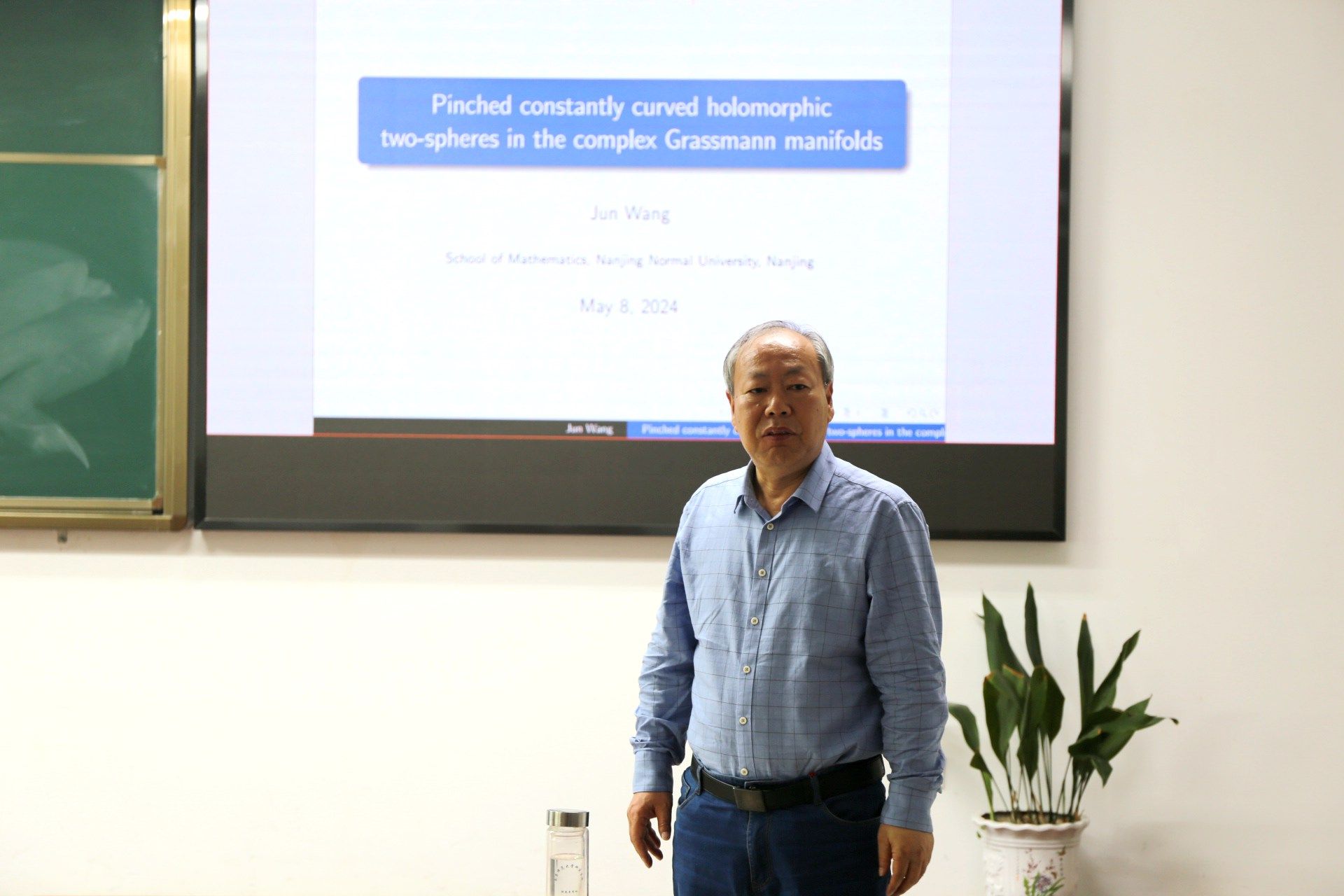 5月8日下午,博彩论坛本学期第五场双周三学术报告会在行健楼学术活动室526举行。此次报告会的主讲人是几何代数研究室王军副教授,报告的题目是“Pinched constantly curved holomorphic two-spheres in the complex Grassmann manifolds”,数学研究所副所长贺伟教授主持了本次报告会,几何代数研究室方金辉教授和部分研究生参加了本次报告会。