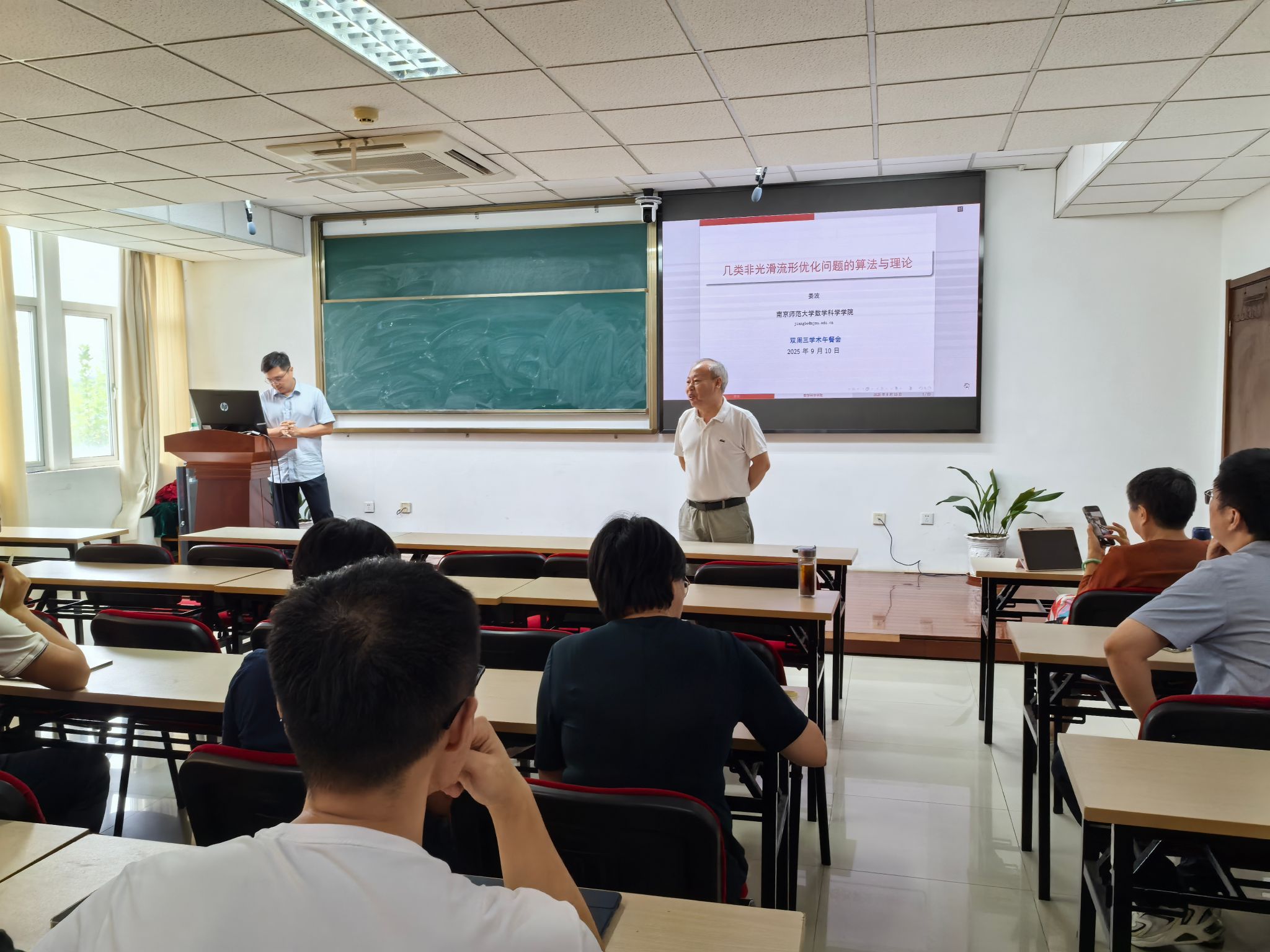 9月10日,博彩论坛本学期第一场双周三学术报告会在行建楼学术活动室526举行。此次报告会主讲人是计算科学研究室的姜波教授,报告的题目是“几类非光滑流形优化问题的算法与理论”,数学研究所副所长贺伟教授主持了本次报告会。数学研究所副所长吴奕飞教授、张晓岩教授,几何代数研究室陈慧斌副教授、方金辉教授,现代分析研究室许刚教授,计算科学研究室蔡邢菊教授、蔡文君教授、南彩霞博士、孙越泓副教授、谈雪媛副教授、王丽教授、王雨顺教授、徐玲玲教授、徐缘副教授,应用数学研究室何跃副教授、杨云博士,运筹控制研究室常虹副教授、戴国伟副教授、杜佳丽副教授、李婷副教授,金融统计研究室杜秀丽教授、高启兵教授、孙海琳教授、孙源副教授、孙志斌教授、吴琼博士、周秀轻教授以及部分研究生参加了本次报告会。