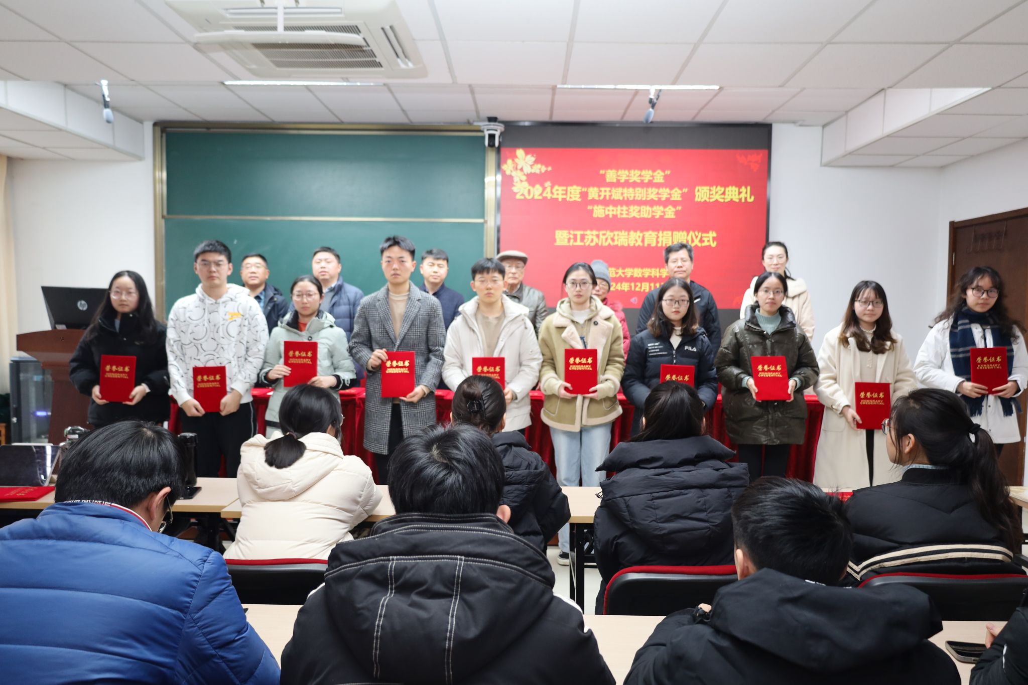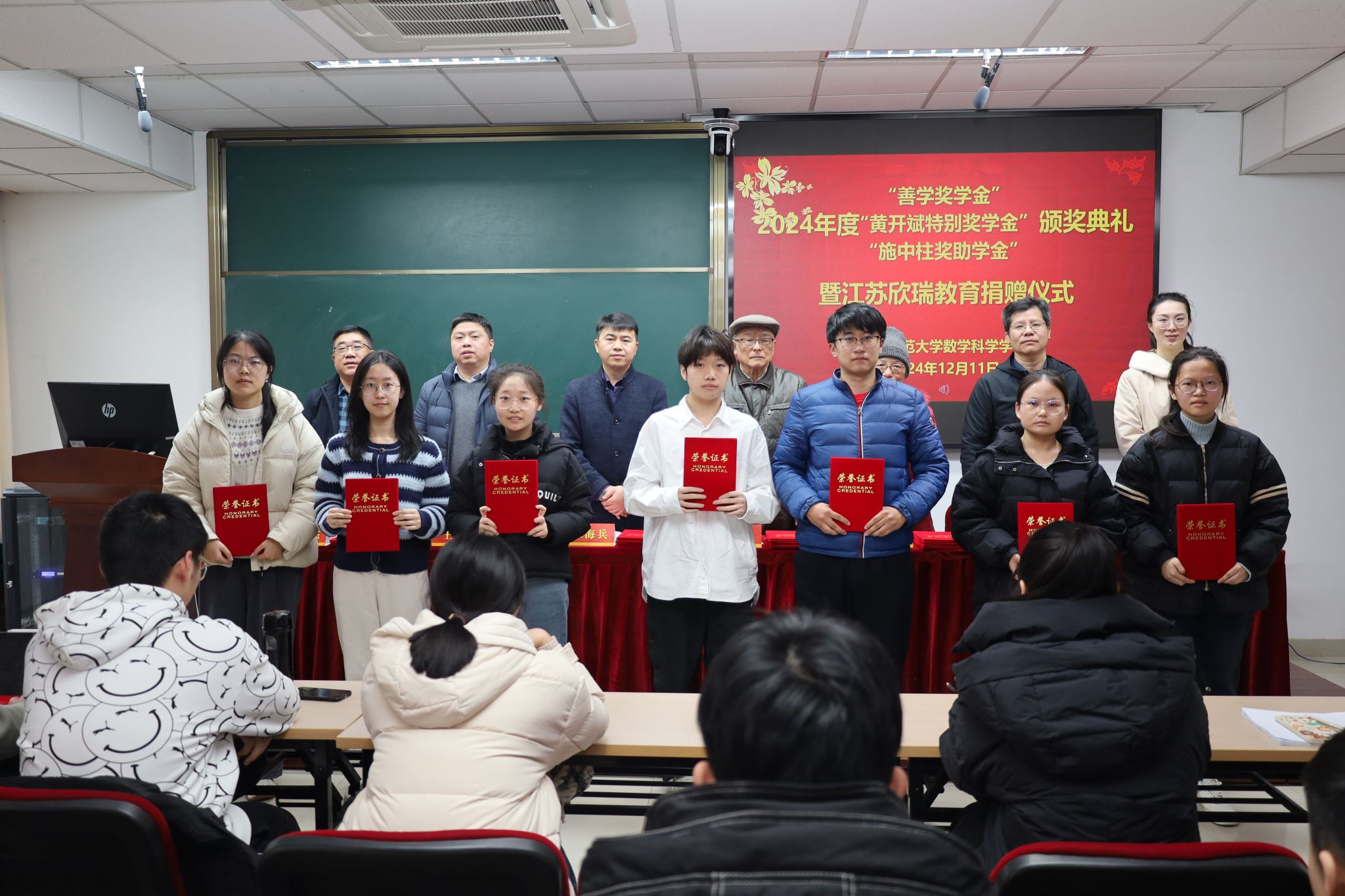 接着,数科院副院长王锋宣读了2024年度“善学奖学金”、“黄开斌特别奖学金”和“施中柱奖助学金”获奖名单,陈童瑛等14位同学获得了“善学奖学金”,陈安琪等10位同学获得了“黄开斌特别奖学金”,赵恒杨等15位同学获得了“施中柱奖学金”,王伟涛等5位同学获得了“施中柱助学金”。在充满喜悦与鼓舞的氛围中,与会嘉宾及老师们逐一为获奖同学颁发荣誉证书,并共同合影留念。