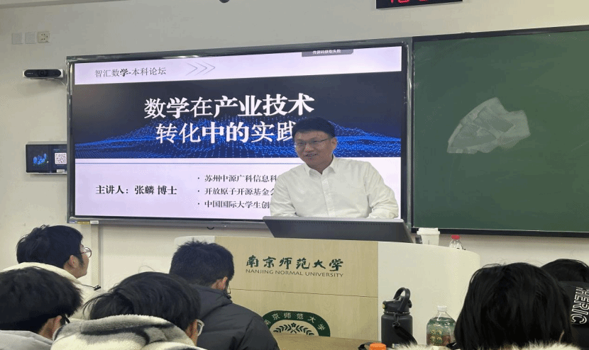 为提升学生数学素养,数科院于12月18日下午在学明楼306教室举办第四期“智汇数学”本科论坛。受邀主讲人为苏州中源广科信息科技有限公司创始人张麟博士,报告主题为“数学在产业技术转化中的实践”。学院副院长周海燕教授主持了本次论坛,数科院24级1班2班全体同学参与了论坛。
