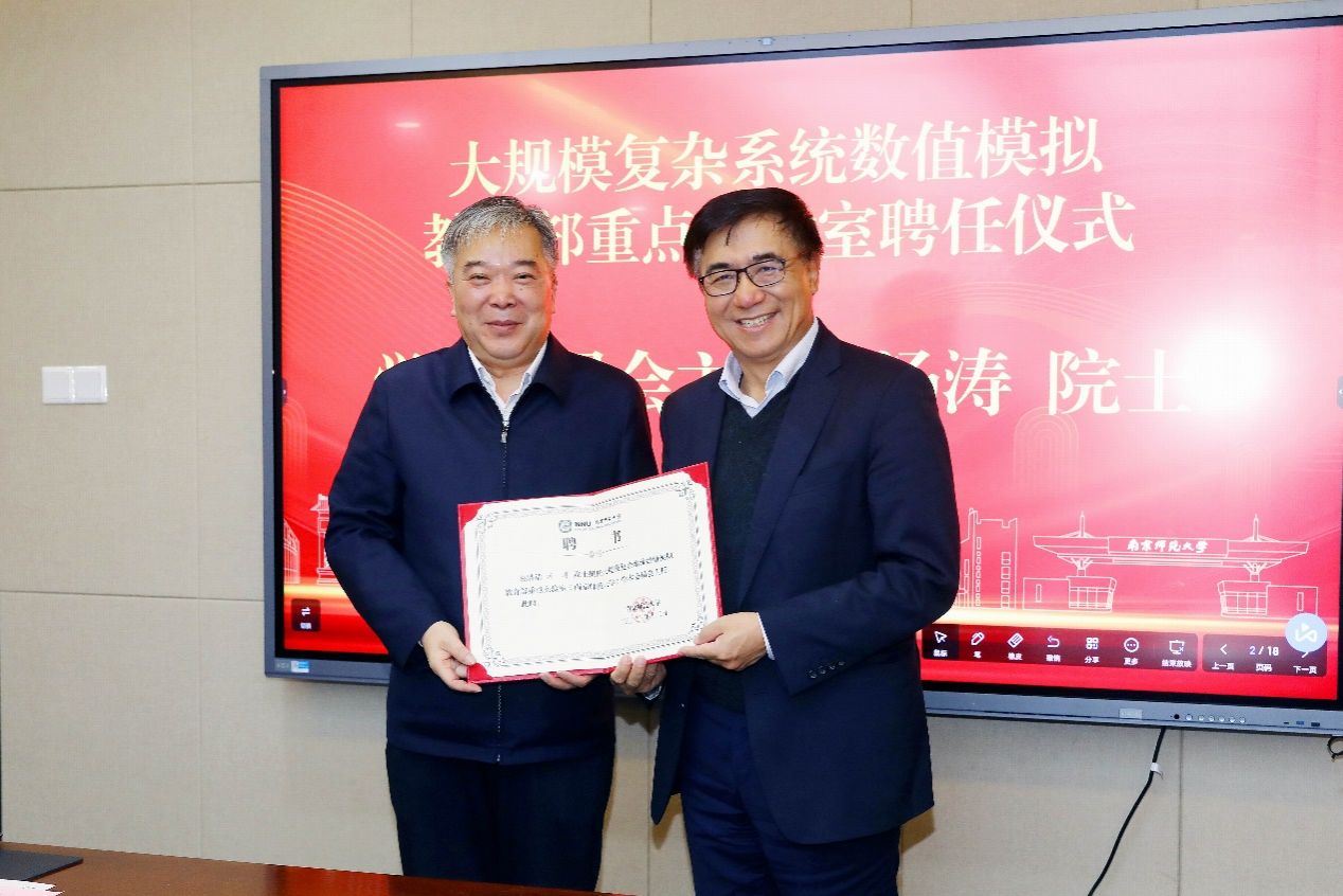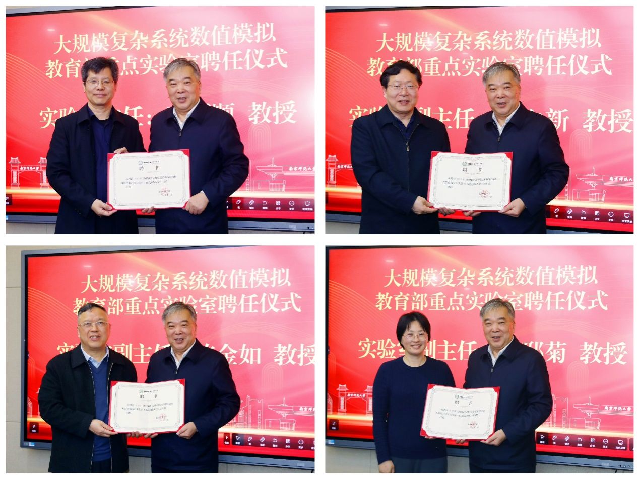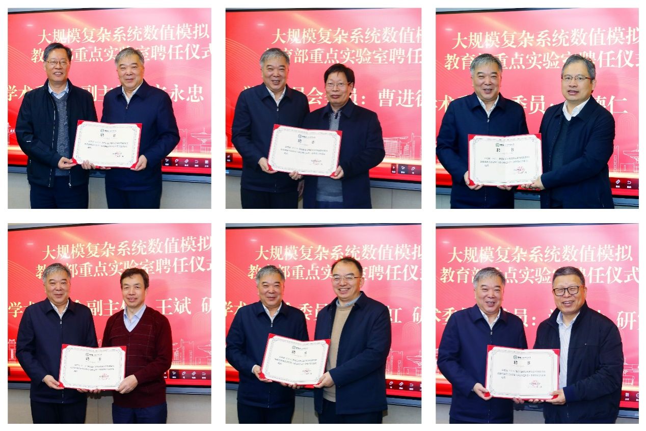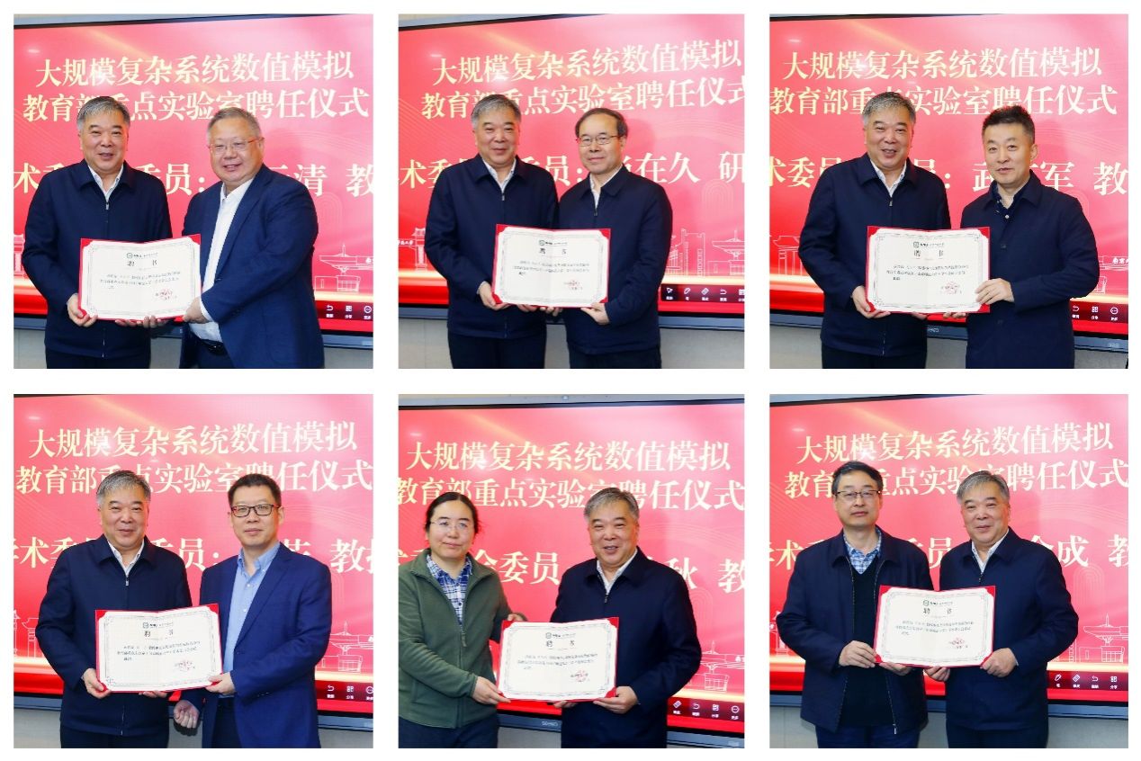 会上举行了大规模复杂系统数值模拟”教育部重点实验室聘任仪式,华桂宏为实验室第一届学术委员会主任汤涛、副主任宋永忠、王斌,成员曹进德、戴彧虹、韩德仁、洪佳林、黄云清、李若、尚在久、武海军、汪艳秋、尹会成以及实验室主任王雨顺,副主任田立新、陈金如、蔡邢菊颁发聘书并合影留念。